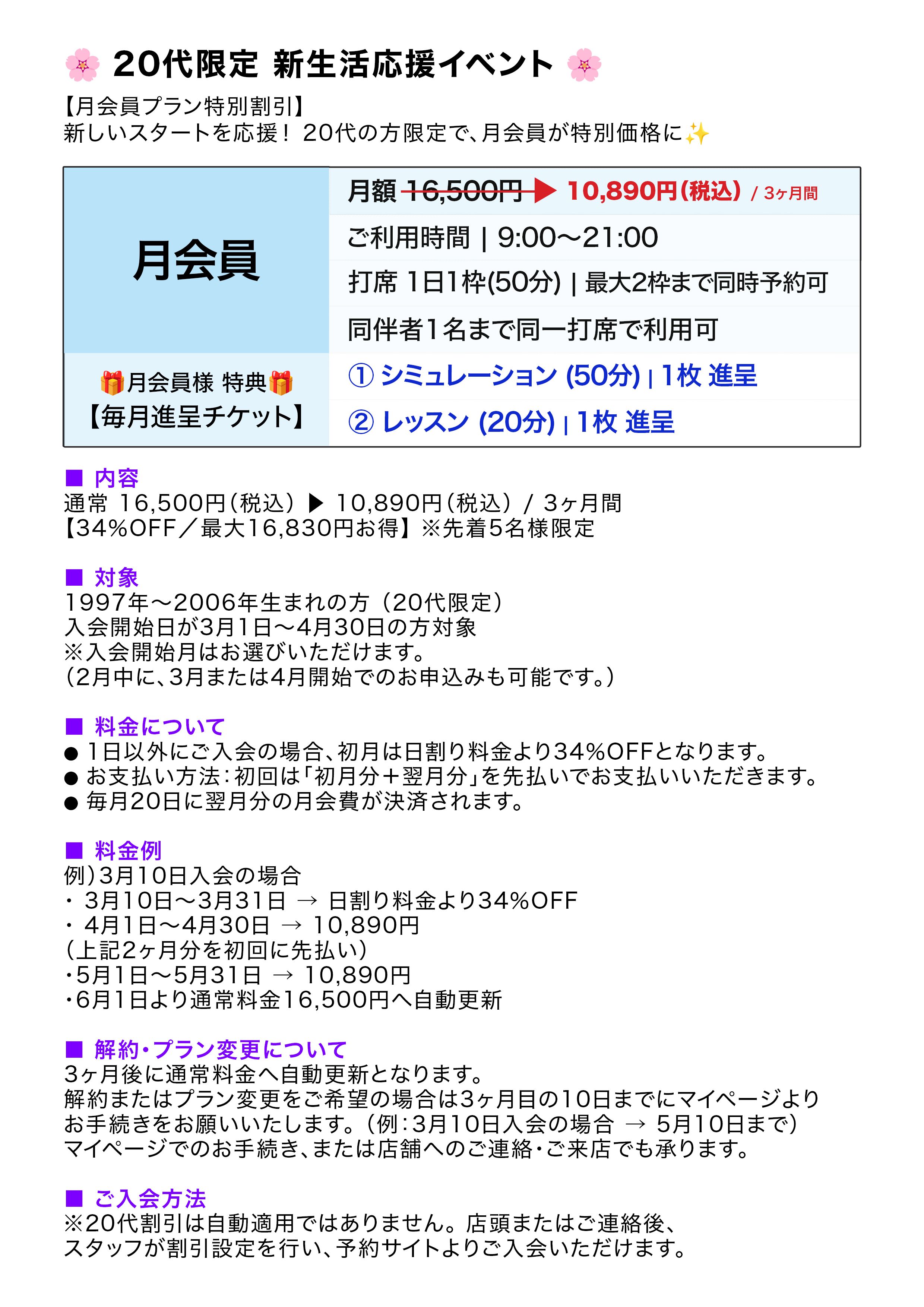 この春、新しいスタートを迎える20代の皆さまへ向けて、月会員プラン特別割引キャンペーンを実施いたします。