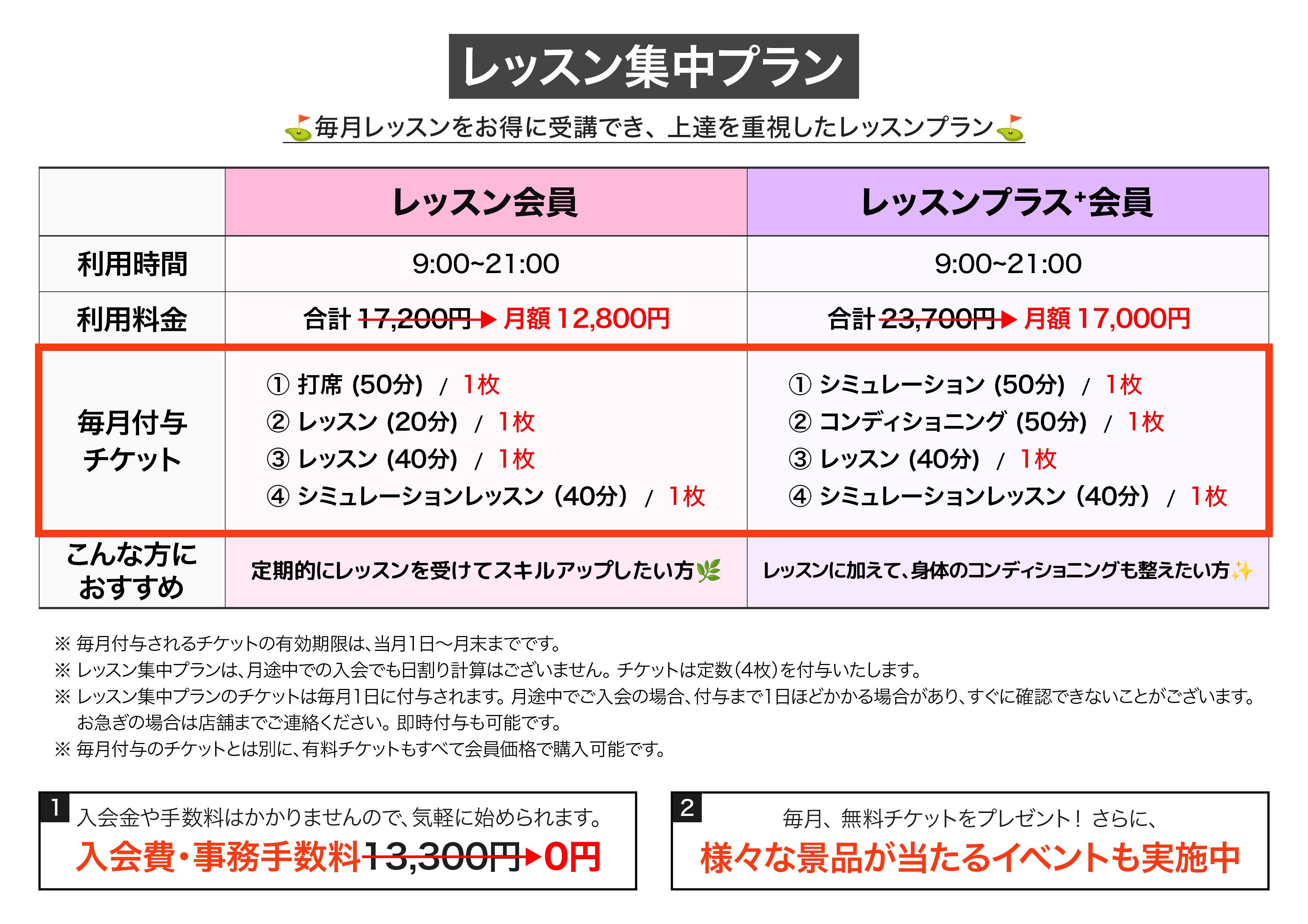 ※ レッスン会員&レッスンプラス会員は、月途中での入会でも日割り計算はございません。 チケットは定数(4枚)を付与いたします。 ※ レッスン会員&レッスンプラス会員のチケットは毎月1日に付与されます。 月途中でご入会の場合、付与まで1日ほどかかる場合があり、すぐに確認できないことがございます。お急ぎの場合は店舗までご連絡ください。 即時付与も可能です。